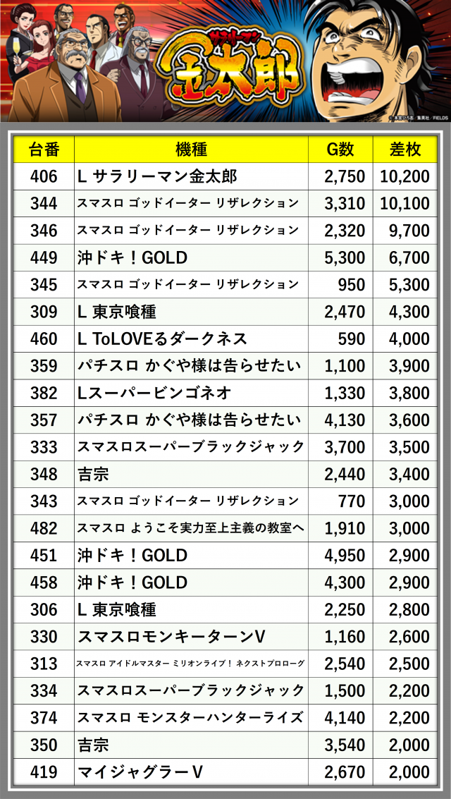 ※差枚数順に掲載しています