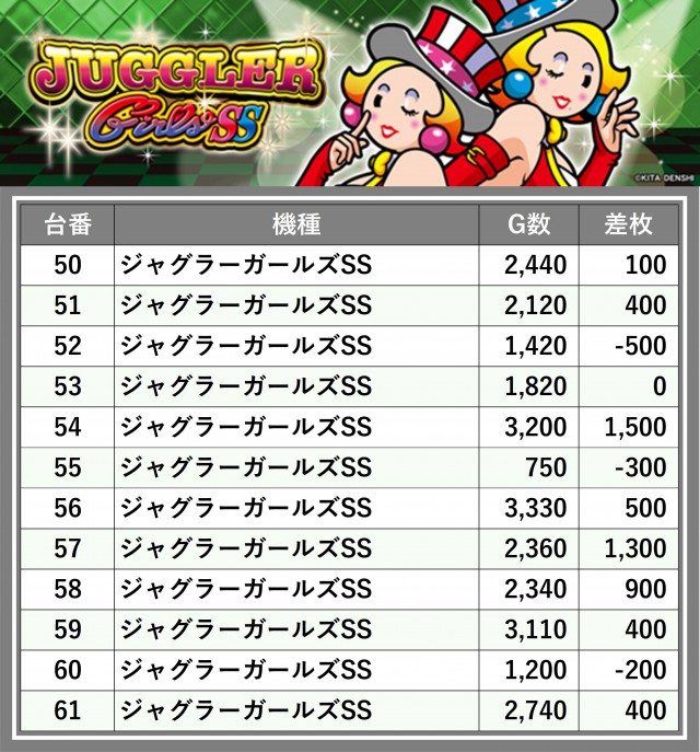 厳選された取材対象機種をはじめ、その他スロット全体から好記録が飛び出した!プレイヤーが楽しんだ1日を下記データにて振り返ってみて欲しい。