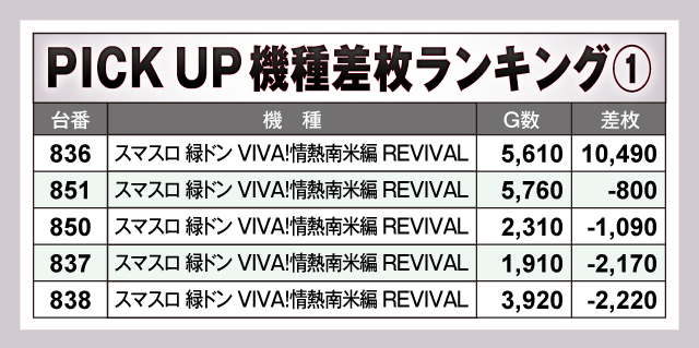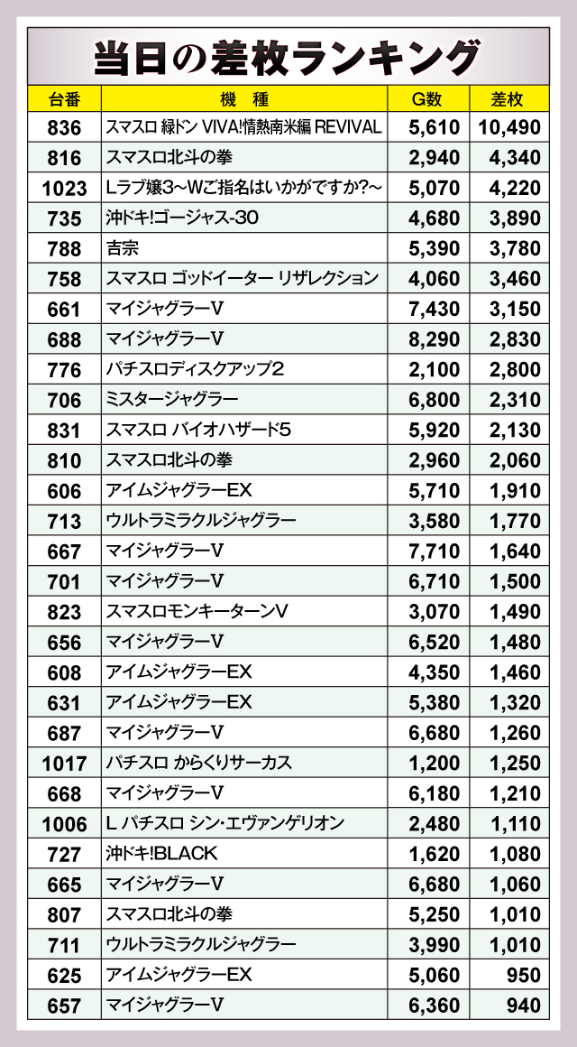 この日の主役は『スマスロ 緑ドン VIVA!情熱南米編 REVIVAL』。836番台が+10,490枚と見事に万枚達成の大成果をあげている。すこし差が開いて『スマスロ北斗の拳』816番台が+4,340枚、『Lラブ嬢3〜Wご指名はいかがですか?〜』1023番台が+4,220枚とつづく。以下『沖ドキ!ゴージャス-30』735番台を含む4台が3,000枚オーバー、『マイジャグラーⅤ』688番台を含む5台が2,000枚オーバーと、この日の盛り上がりぶりを証明していた。