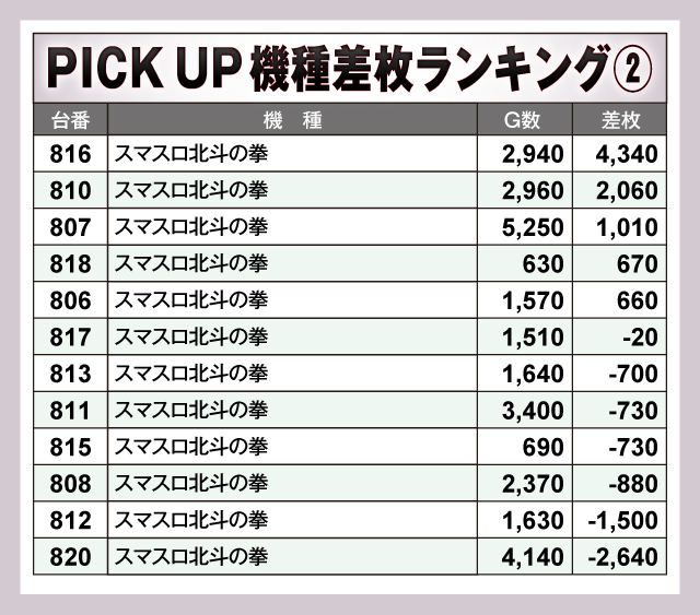 同店の中心4機種をピックアップして見ていこう。『スマスロ 緑ドン VIVA!情熱南米編 REVIVAL』は5台中1台のみがプラス差枚だが万枚を突破していて、トータルではプラス差枚になっている。12台設置の『スマスロ北斗の拳』は5台がプラス。816番台と810番台が活躍し、マイナスをリカバーしていたようだ。