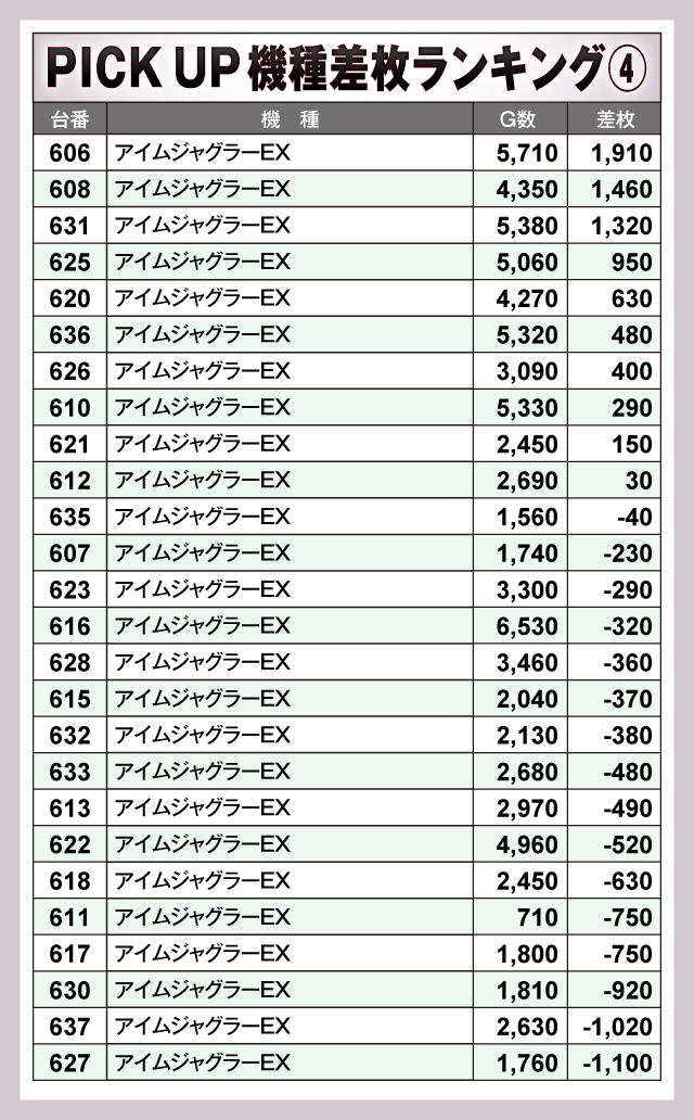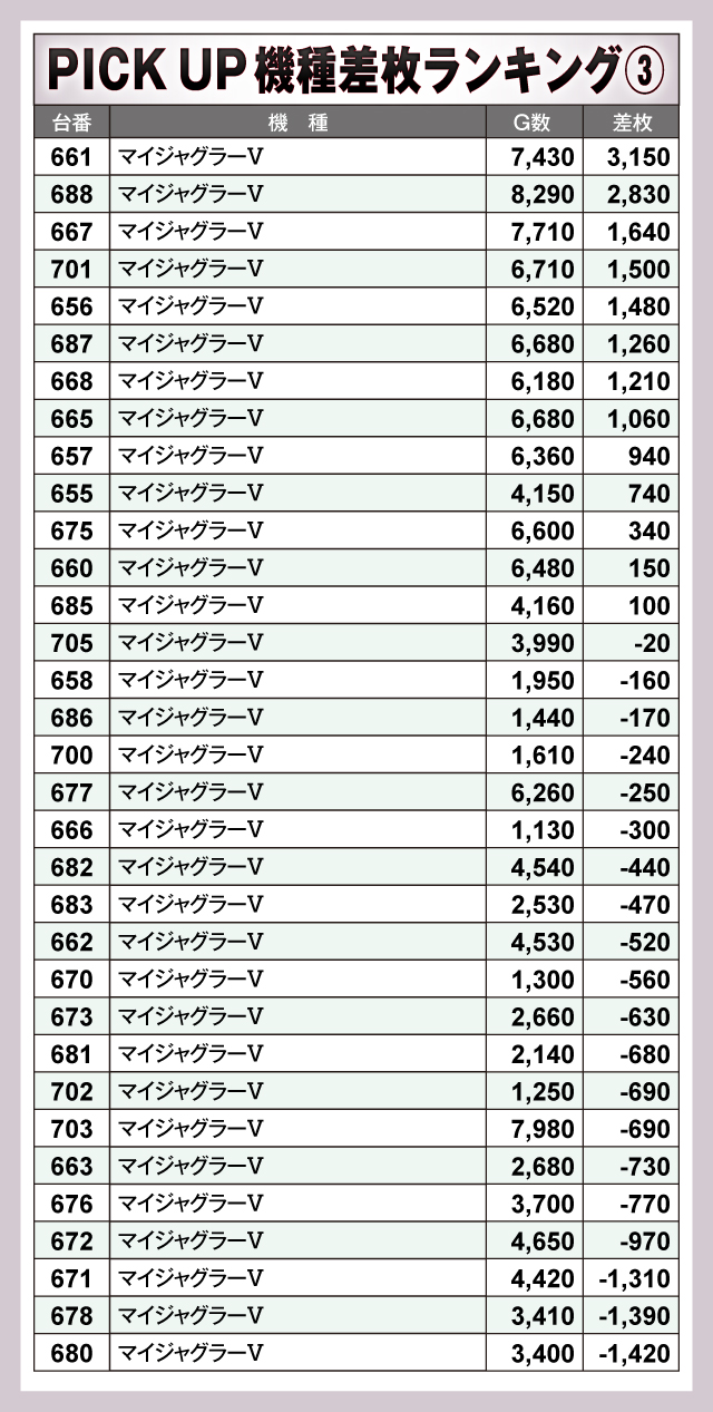 大量設置の人気機種『ジャグラー』シリーズを見ていくと、『マイジャグラーⅤ』は33台中13台、『アイムジャグラーEX』は26台中10台がプラス差枚。いずれもしっかりとG数を回された台が結果を残していたようだ。