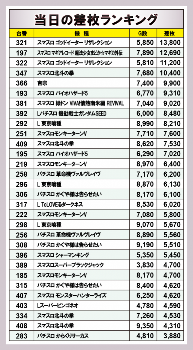『スマスロ ゴッドイーター リザレクション』から2台、『スマスロ マギアレコード 魔法少女まどか☆マギカ外伝』『スマスロ北斗の拳』の3機種から計4台の万枚OVERが発生し、目に見えて分かりやすい盛り上がりを確認。さらに8~9,000枚OVERなど熱気が噴出した形跡も見られ、全体的に大台突破が目立った1日になったようだ。新台から人気機種まで幅広く名を連ねている点も見逃せず、ファンは心地良い空間で嬉々としてレバーを叩いていた。