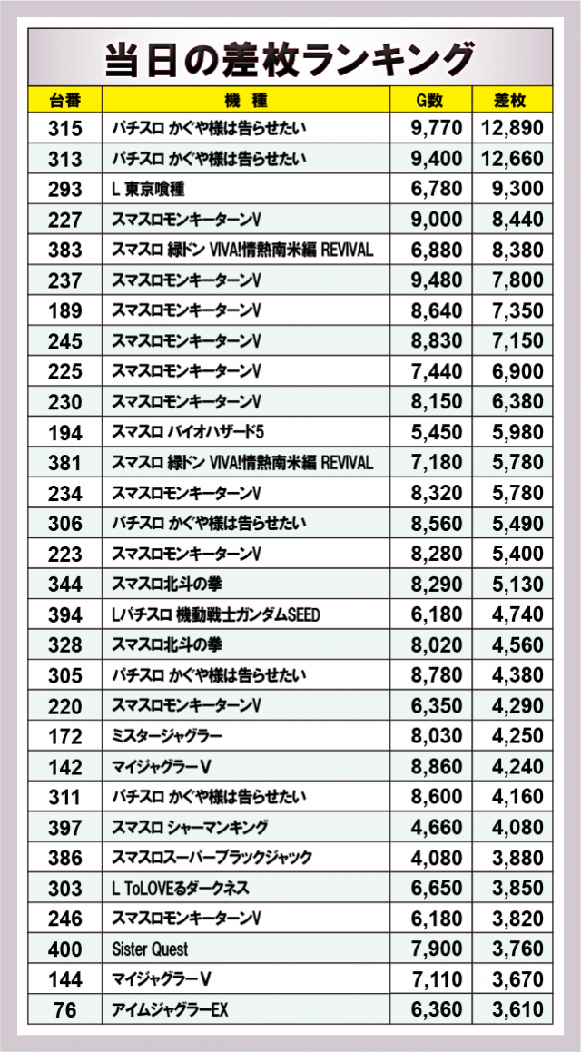 『パチスロ かぐや様は告らせたい』から2台の万枚OVERが発生し、店内の活気と熱気を大いに引き上げてくれた。そのほか、『L 東京喰種』『スマスロモンキーターンV』『スマスロ 緑ドン VIVA!情熱南米編 REVIVAL』から8~9千枚OVERと続き、『スマスロモンキーターンV』は複数台がランクインし、遊技していたファンは大きな熱量に興奮を抑えられなかったのではないだろうか。