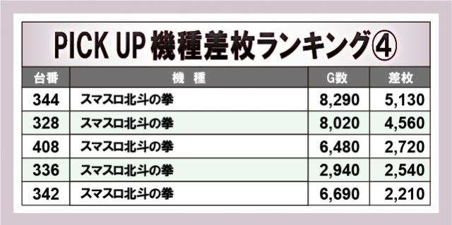 当日とくに店内を盛り上げた機種は上表の5機種で、スマスロ人気機種を筆頭に高い活気を披露。回転数をみても粘り強くレバーを叩いていた光景が上表から窺うことができ、大きなマイナスを記録していない点からも、これらの機種たちが当日の盛り上がりを牽引していたのは間違いなさそうだ!