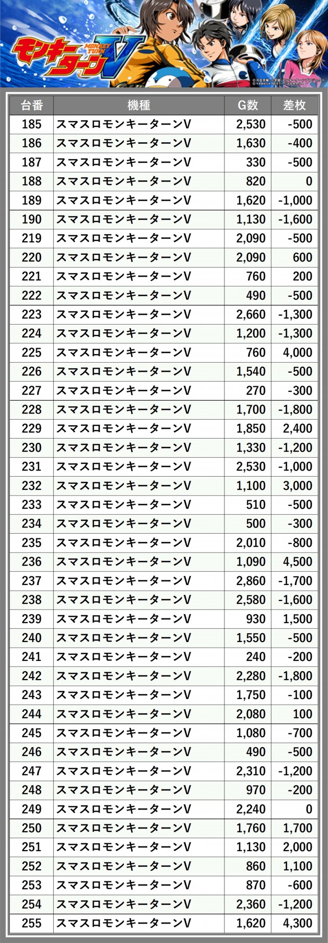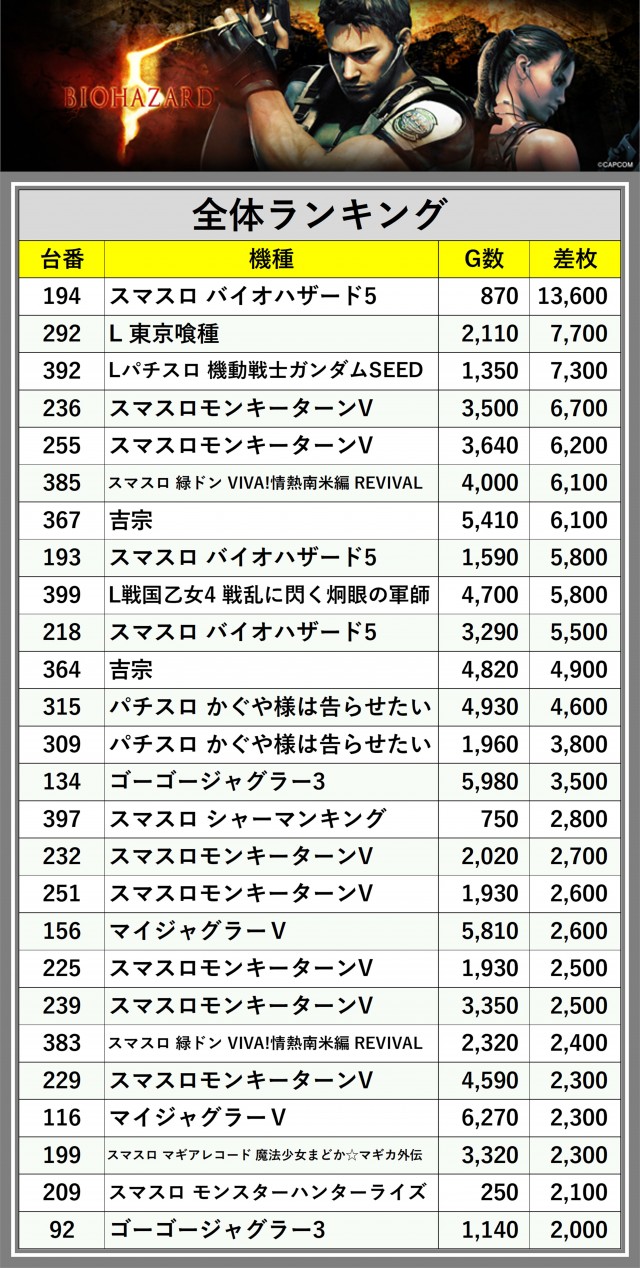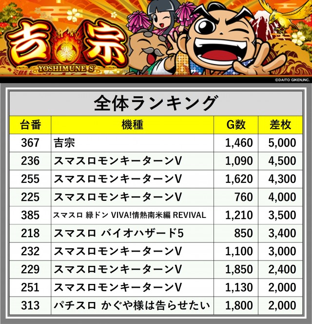 厳選された取材対象機種をはじめ、その他スロット全体から好記録が飛び出した!プレイヤーが楽しんだ1日を下記データにて振り返ってみて欲しい。