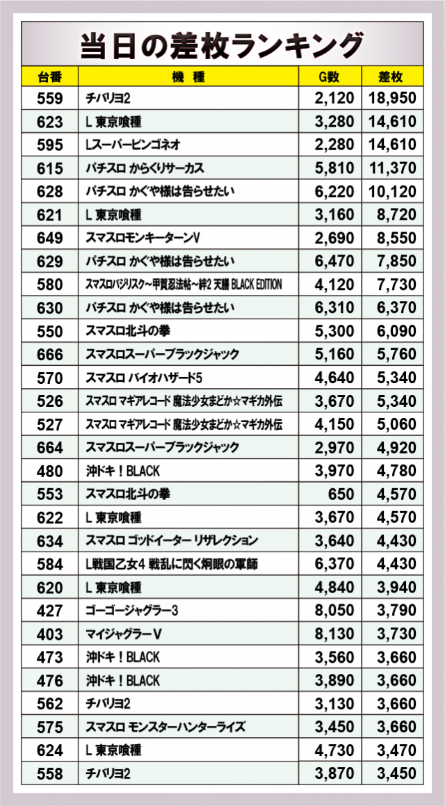 万枚OVERが発生した『L 東京喰種』『チバリヨ2』では、圧倒的な熱気が放たれていたのが印象的だ。また『スマスロモンキーターンV』の島もまとまった出玉を獲得する台が多数発生し、盛り上がりを牽引していたと言えるだろう。スマスロ機が目立つ一方で、『沖ドキ!BLACK』『ゴーゴージャグラー3』のメダル機も高い活気と熱気を維持していた様子も見逃せず、同店の実力を実感せざるを得ない内容となっている。