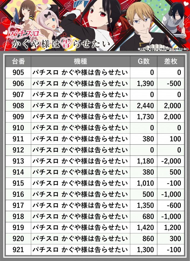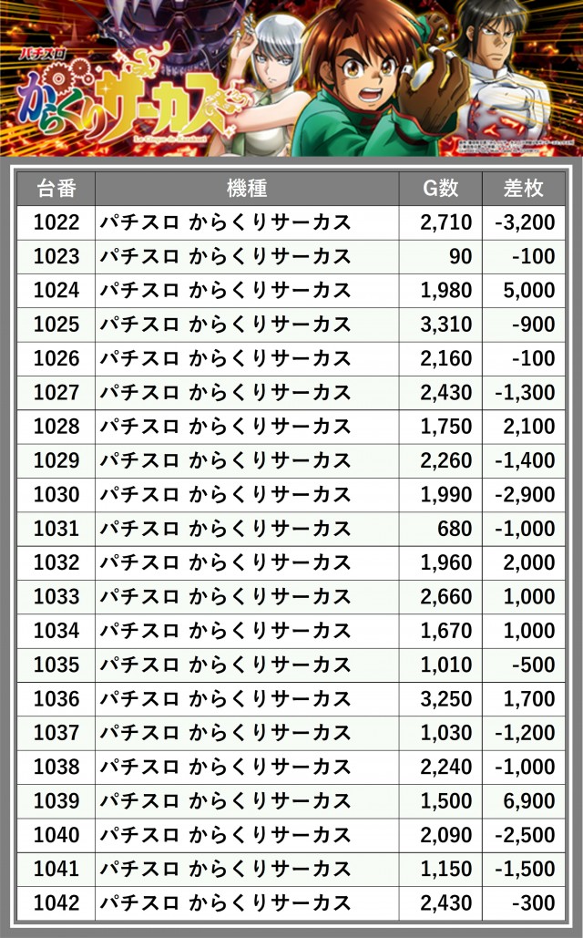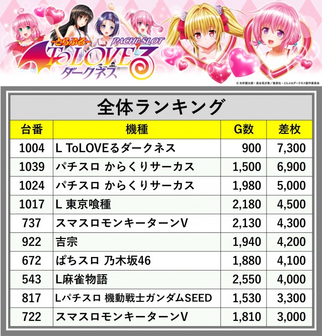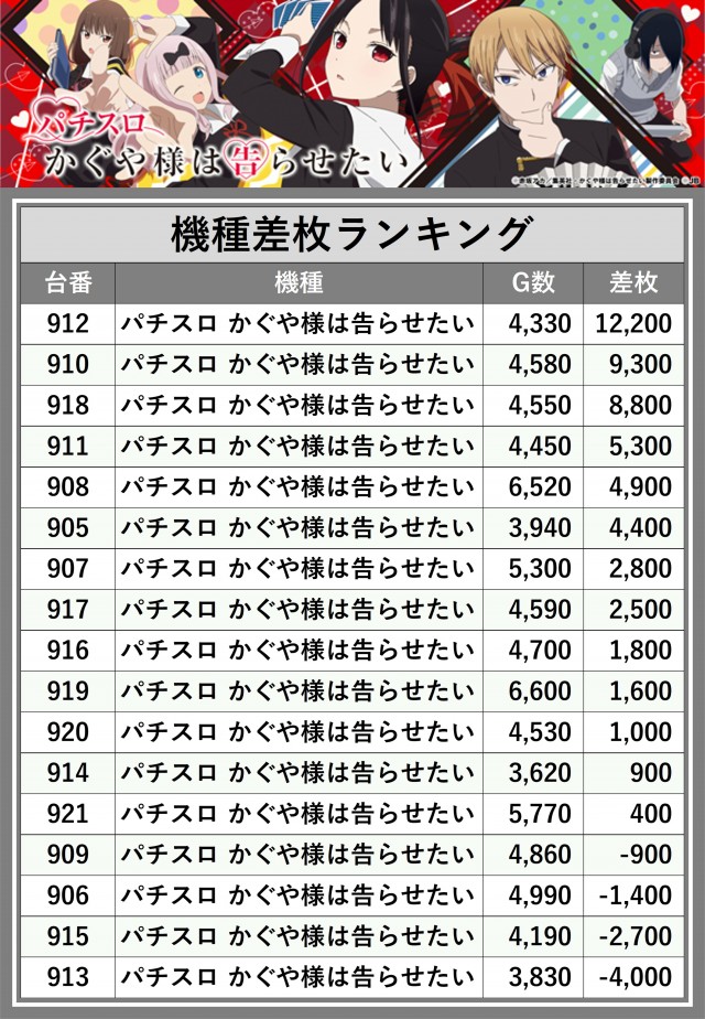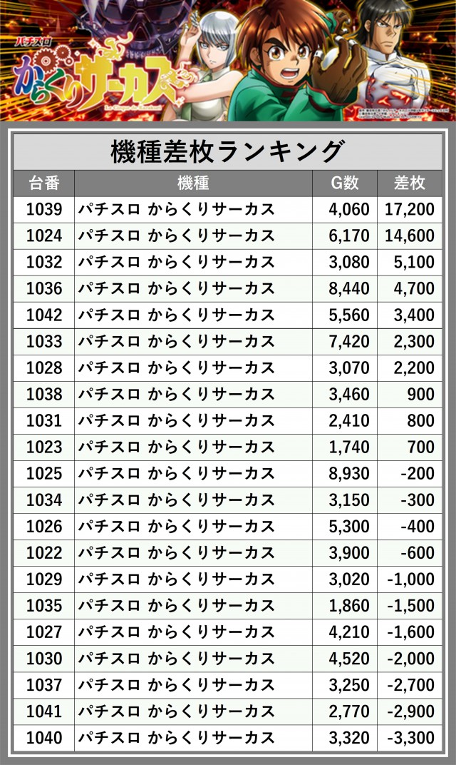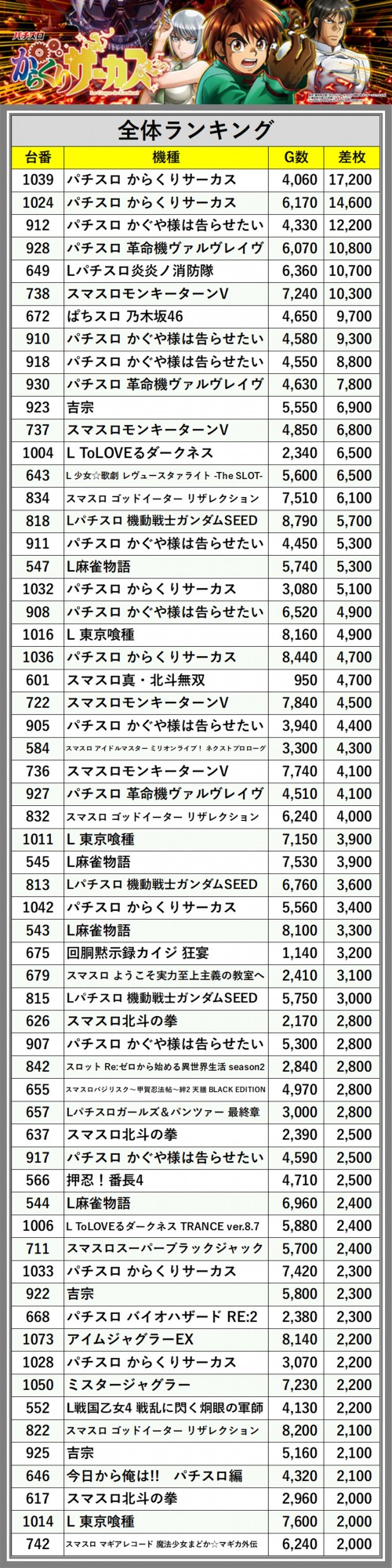 ※差枚数順に掲載しています