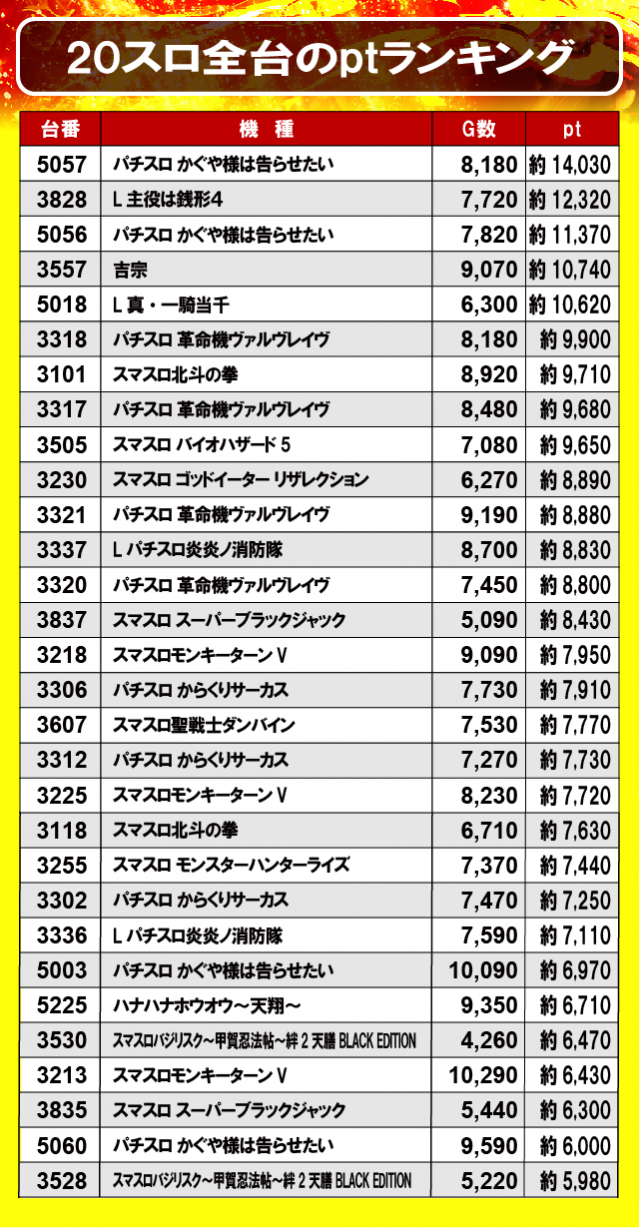 『パチスロ かぐや様は告らせたい』『L主役は銭形4』『吉宗』『L 真・一騎当千』から計5台の万ptOVERが生まれ、凄まじい熱気が放たれていた!また、20スロptランキング上位30台は約5,000ptOVERから名を連ねている点も、同店の高い実力を感じずにはいられない内容となっていた!