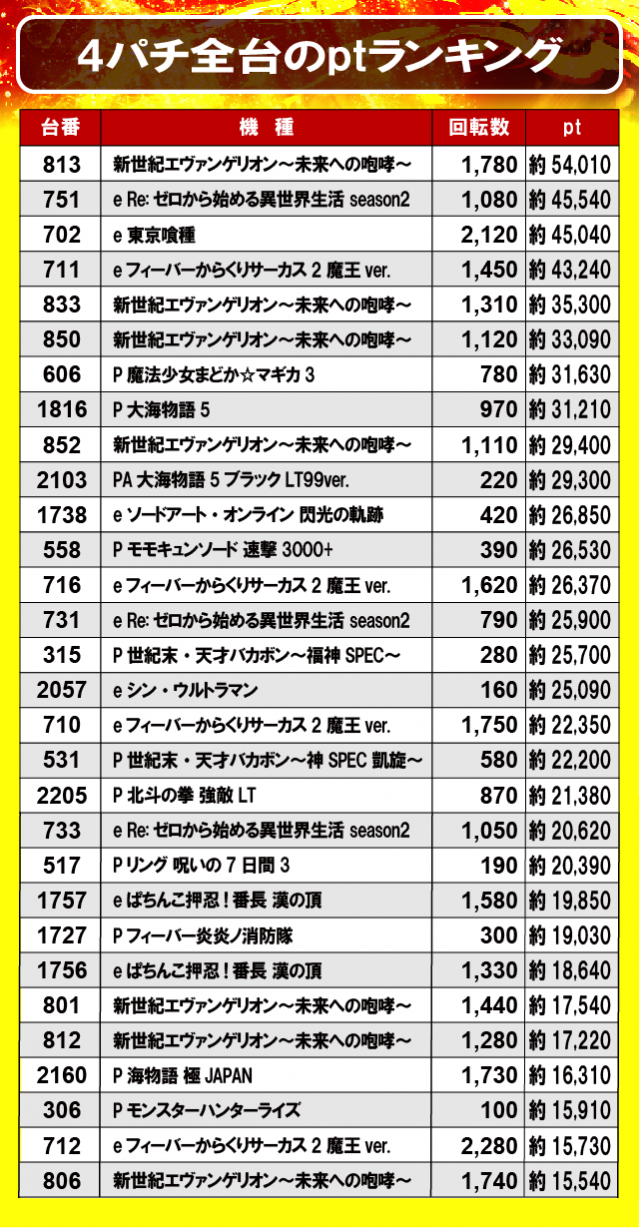 『新世紀エヴァンゲリオン〜未来への咆哮〜』は約54,010ptを獲得しており、一際存在感を放っていた。『e Re:ゼロから始める異世界生活 season2』『e 東京喰種』『eフィーバーからくりサーカス2 魔王ver.』も約40,000ptOVERと追随。いずれも上位30台は好成績を残す盛況ぶりで、パチンココーナーでもファンが笑顔を浮かべる光景が広がっていた!
