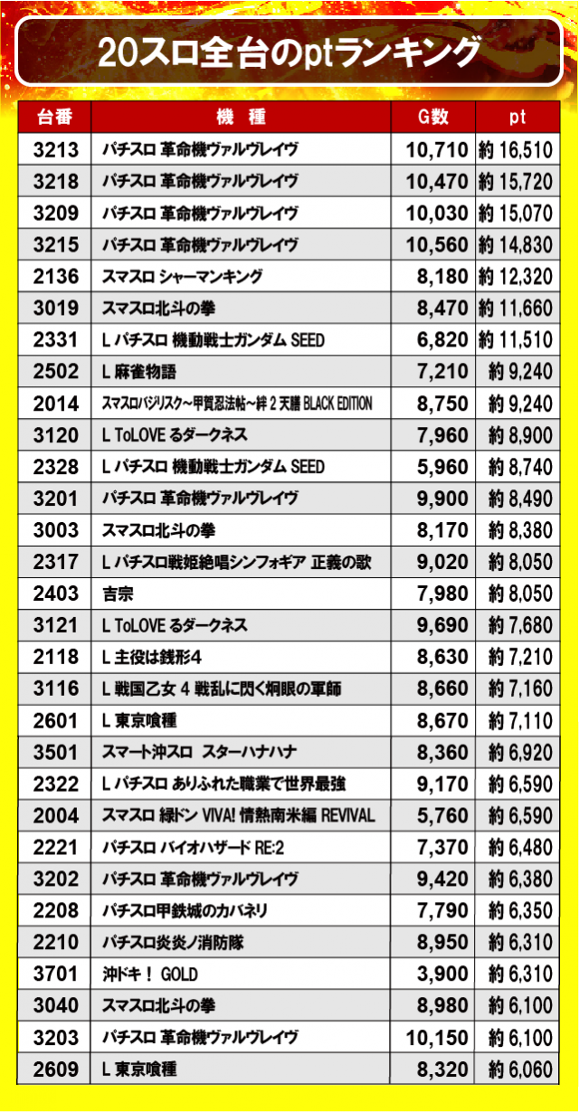 ①20スロ全台のptランキング