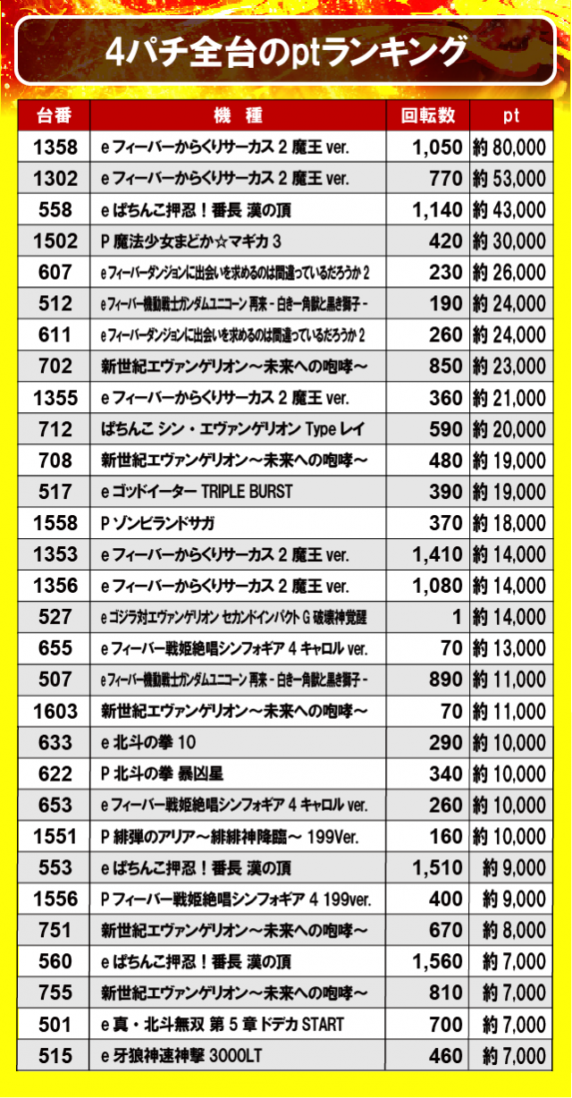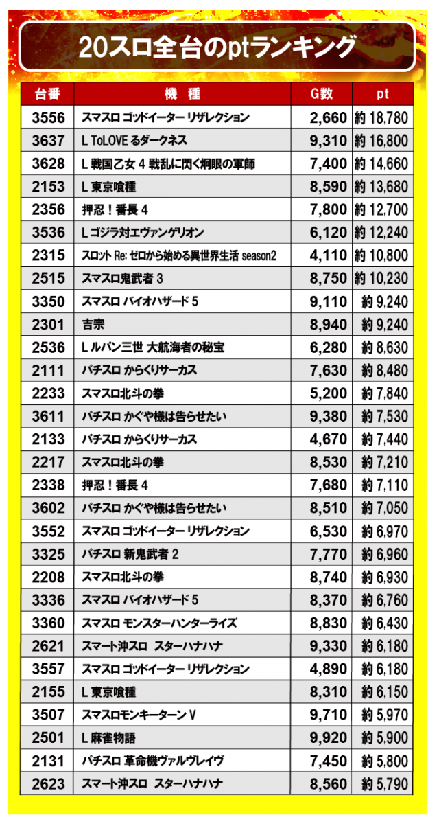 人気機種が名を連ねているのが印象的だが、何よりも鮮烈なのは『スマスロ ゴッドイーター リザレクション』だろう。約18,780ptと大量ptを獲得し、大きな熱気を放っていた。その他にも万ptを達成した台が7台、TOP30の台は5,000ptOVERからとなっており、店内の盛り上がりは凄まじかったと言えるだろう!