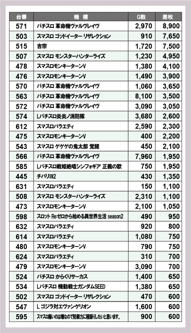※差枚数順に掲載しています