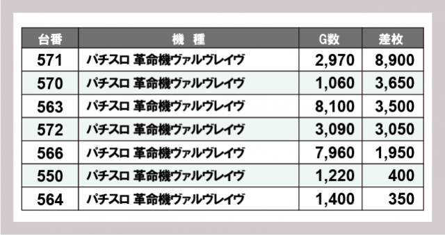 ヴァルヴレイヴ差枚ランキング