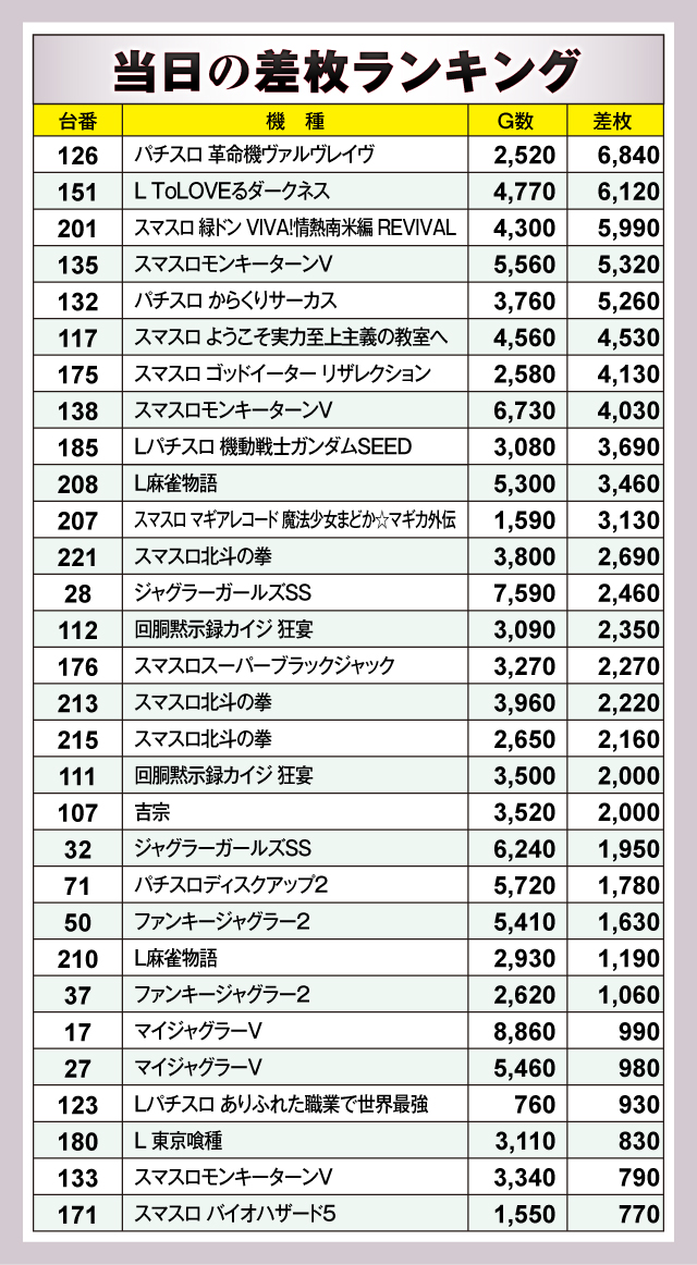 当日の差枚ランキングを見てみると、30台のうち24台が差枚+1,000枚オーバーで、+2,000枚オーバーは19台出現。それらのなかでもっとも優秀だった台は、126番台の「パチスロ 革命機ヴァルヴレイヴ」で、差枚は+6,840枚を獲得! またその他ランクイン機種を見渡すと、人気のスマスロ機種を筆頭に多くの機種がランクイン。幅広い機種にチャンスが隠されていたようだ!