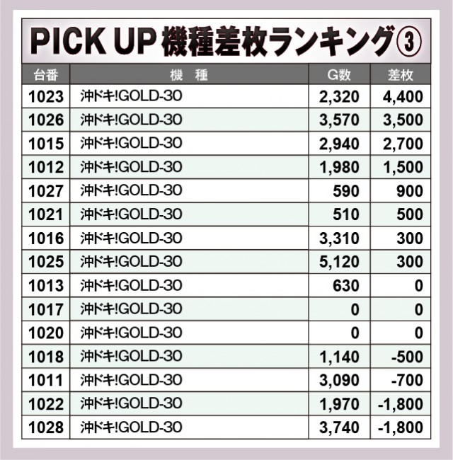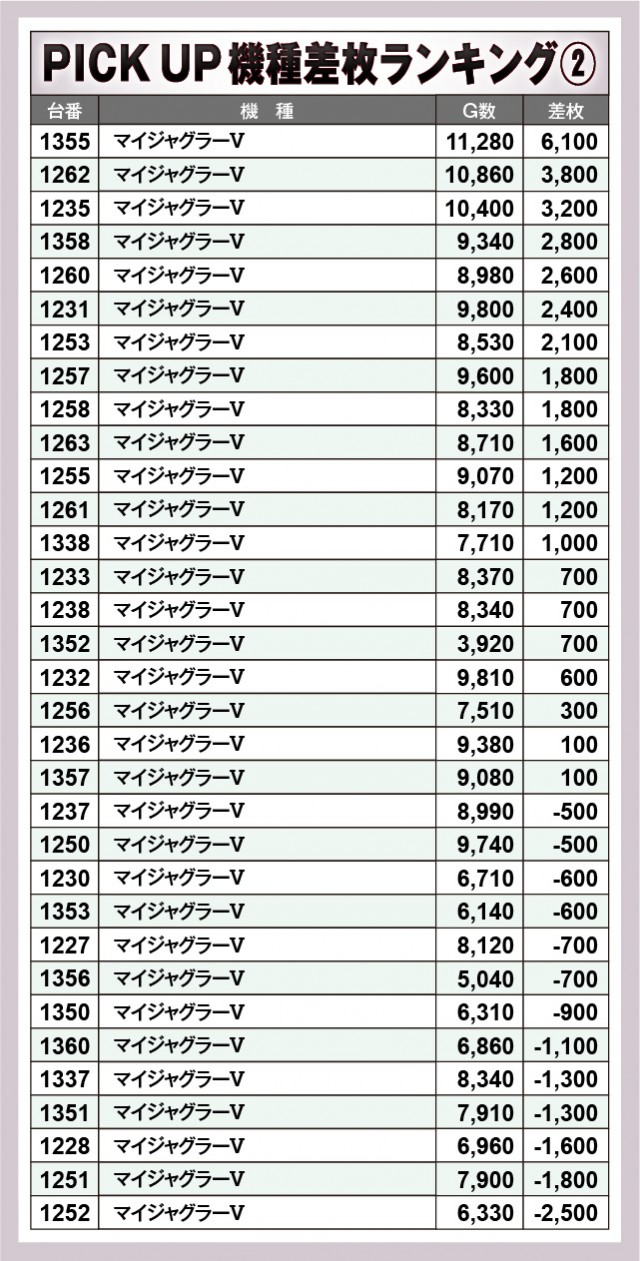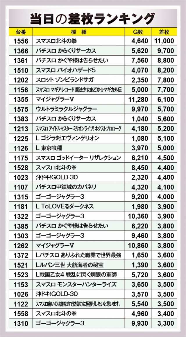 『ゴーゴージャグラー3』『マイジャグラーⅤ』の両機種は複数の万回転OVERが発生しており、他にも8~9,000回転台を記録するなど、活気が絶えることなく閉店を迎えている。ファンが確信を持ってレバーを叩いていたのは明らかで、特に後者の6,000枚OVERは圧巻だ。また『沖ドキ!GOLD-30』も半数以上でプラス差枚数を築いており、こちらもまとまった出玉を確保していたことから、笑顔が咲き乱れたエリアとなっていた。