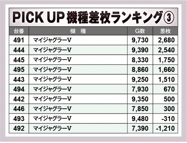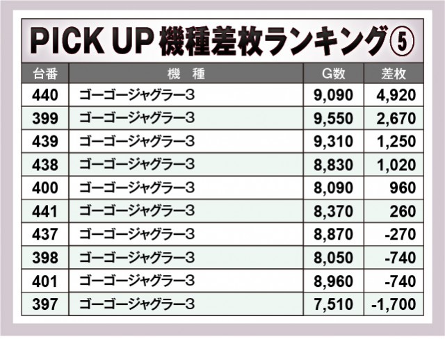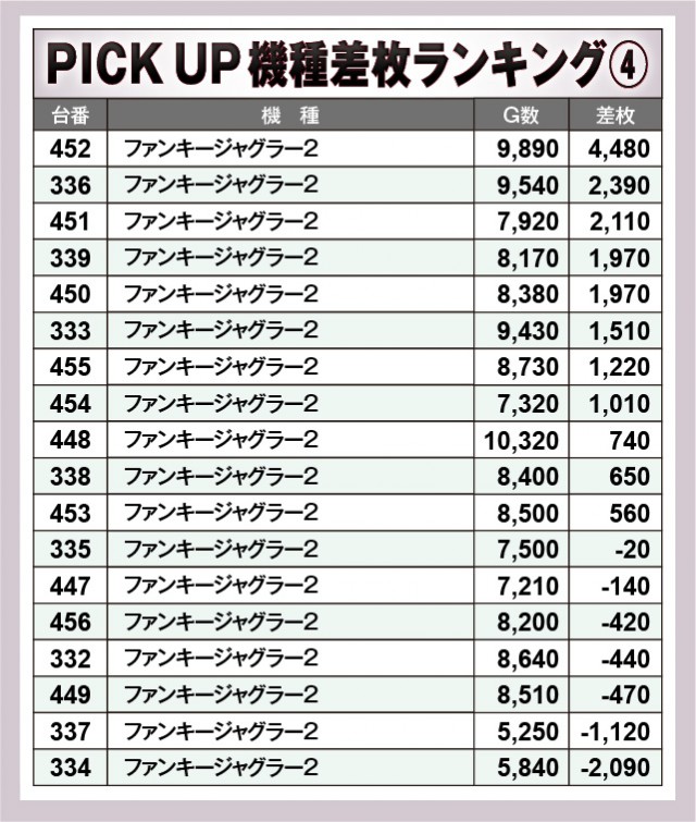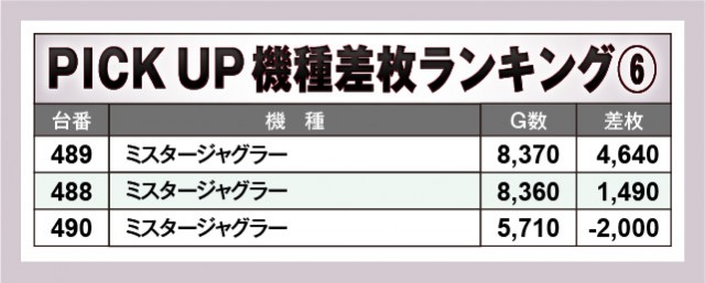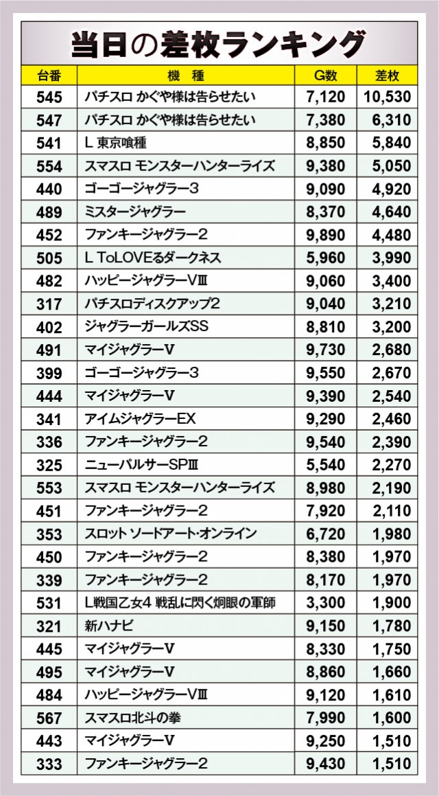 『パチスロ かぐや様は告らせたい』にて万枚OVERが飛び出しており、館内の熱気を引き上げていた。それ以上に存在感を放っていたのが『ジャグラー』シリーズで、設置されているあらゆる台が名を連ねているのが鮮烈だ。『ゴーゴージャグラー3』『ミスタージャグラー』『ファンキージャグラー2』は4,000枚OVERを達成しており、さらに終日を通して打ち込まれていたことから、明らかな手応えを感じていたのは間違いない。