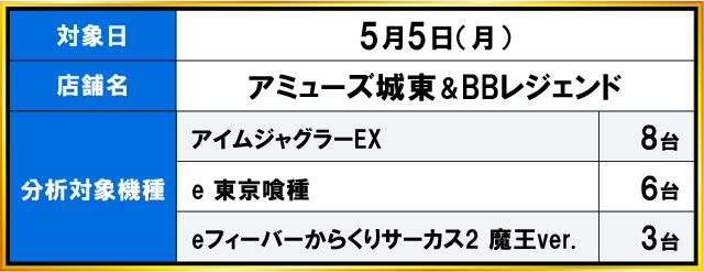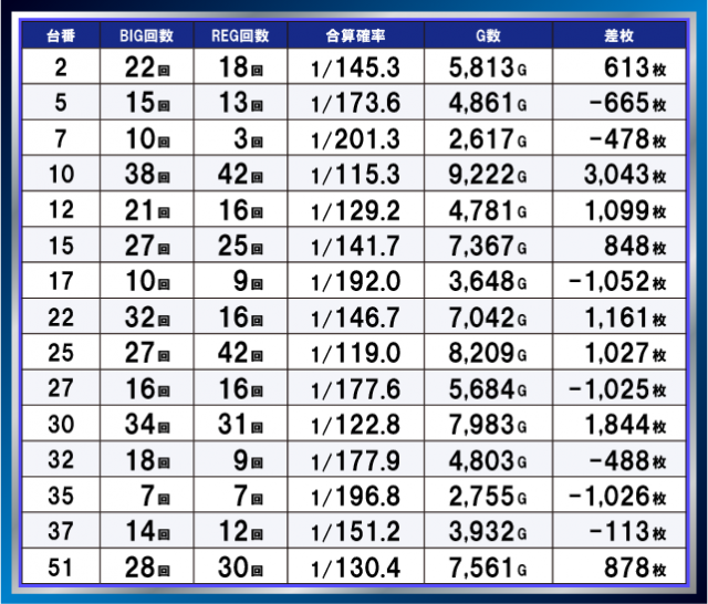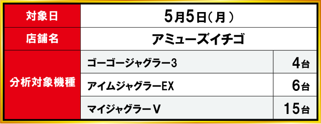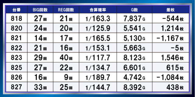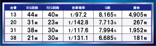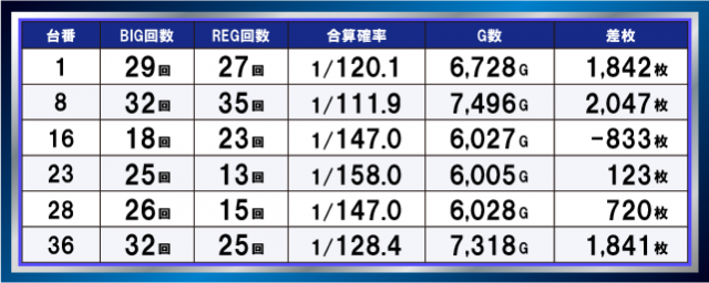 その中でも『ゴーゴージャグラー3』のBIG・REG確率が全台飛びぬけた結果なっており、差枚も素晴らしく、フル稼働となっていたので、打ち手はしっかりと分かっていたのだろう。