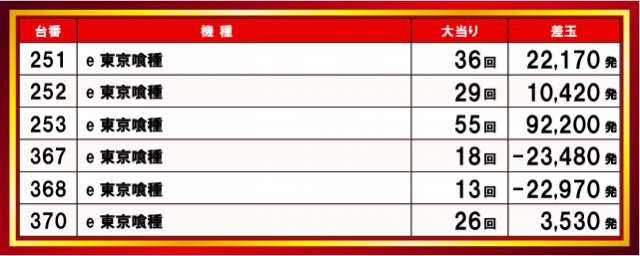 パチンコはコンプリートを達成した新台『e 東京喰種』を中心に『パチスロ からくりサーカス』からも好記録を目撃。