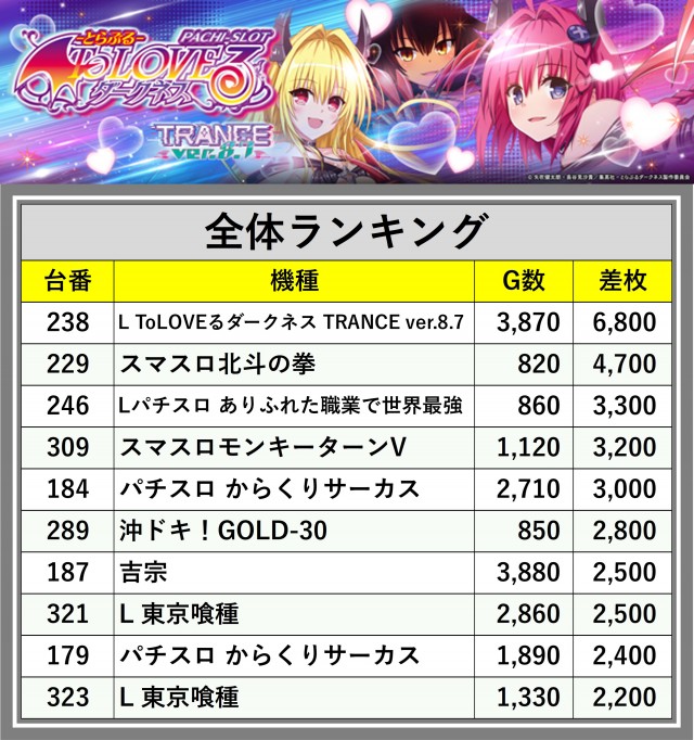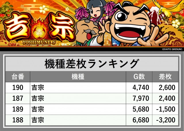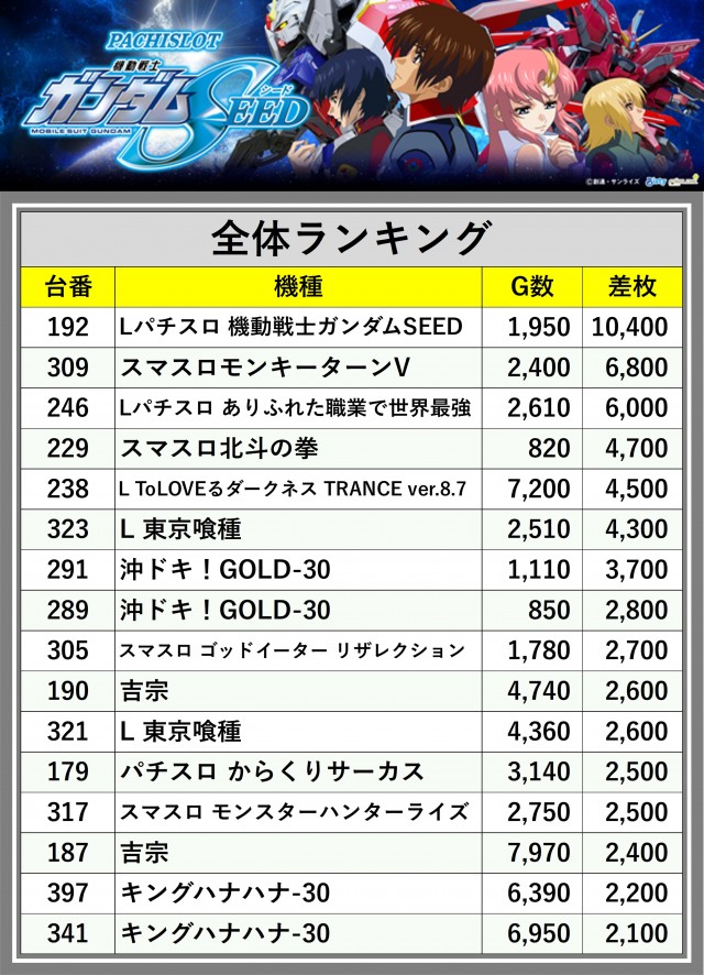 厳選された取材対象機種をはじめ、その他スロット全体から好記録が飛び出した!プレイヤーが楽しんだ1日を下記データにて振り返ってみて欲しい。