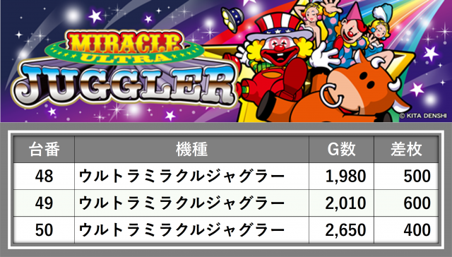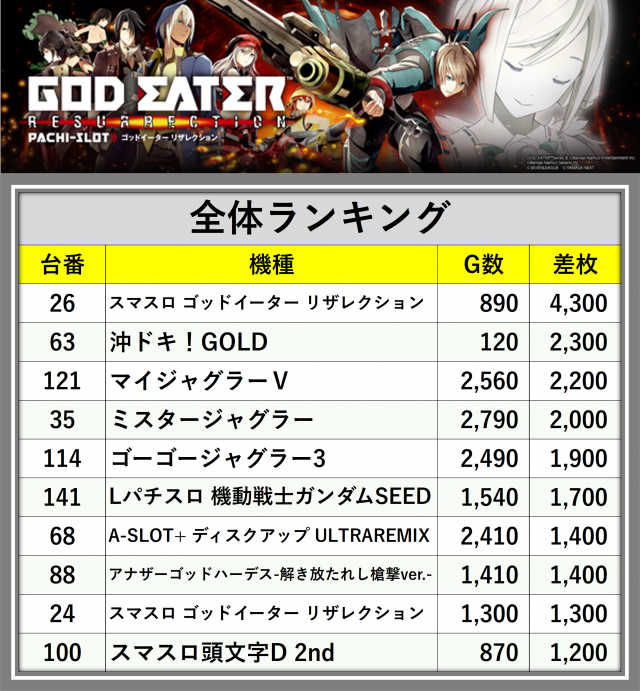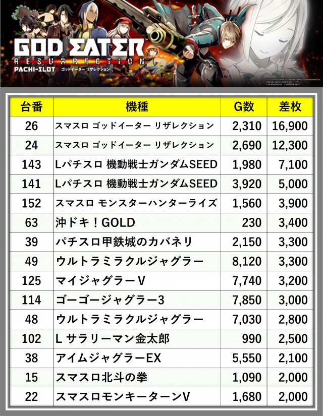 厳選された取材対象機種をはじめ、その他スロット全体から好記録が飛び出した!プレイヤーが楽しんだ1日を下記データにて振り返ってみて欲しい。