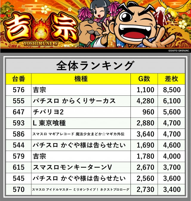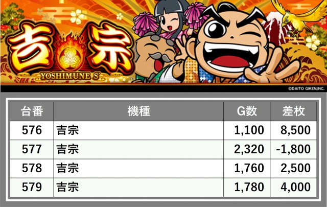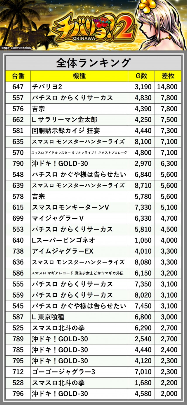 厳選された取材対象機種をはじめ、その他スロット全体から好記録が飛び出した!プレイヤーが楽しんだ1日を下記データにて振り返ってみて欲しい。