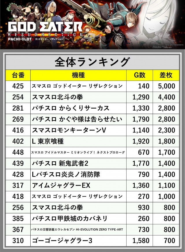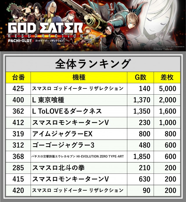 厳選された取材対象機種をはじめ、その他スロット全体から好記録が飛び出した!プレイヤーが楽しんだ1日を下記データにて振り返ってみて欲しい。