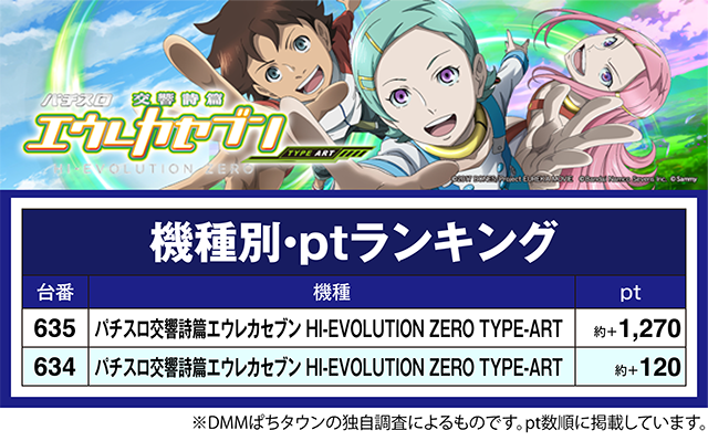 「パチスロ交響詩篇エウレカセブン HI-EVOLUTION ZERO TYPE-ART」は3台中2台がプラスとなり、635番台が約+1,270ptを記録した。