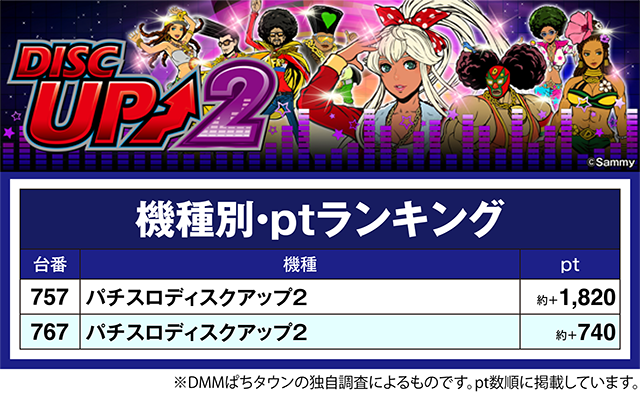 全台がプラスとなった「パチスロディスクアップ2」では、757番台が約+1,800ptオーバー。