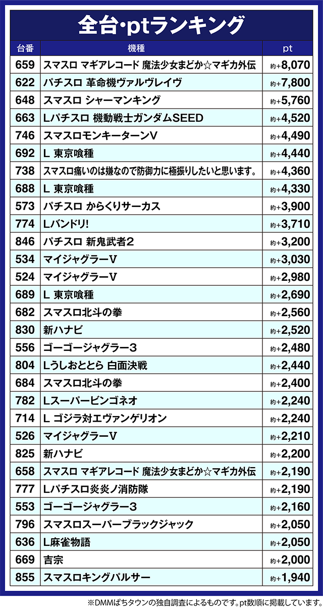 「パチスロ 革命機ヴァルヴレイヴ」の648番台は約+7,800pt、「スマスロ シャーマンキング」の648番台も約+5,760ptを記録。