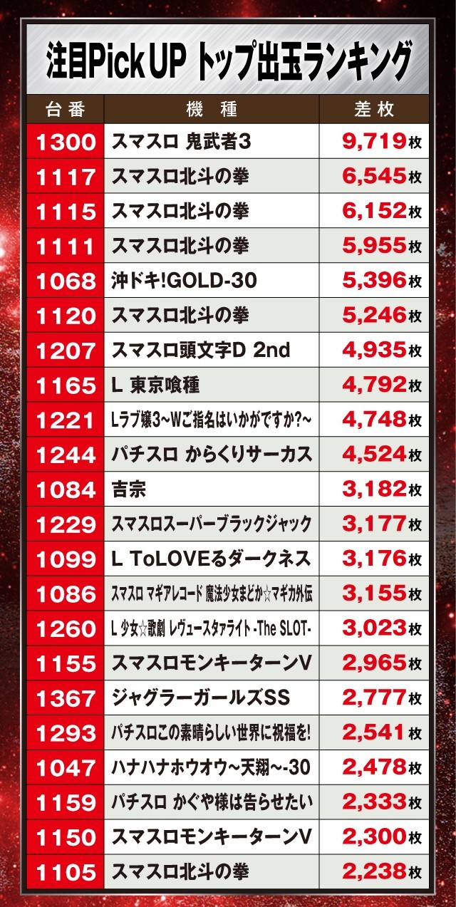 また、その他の機種で特に目立っていたのが『スマスロ北斗の拳』。1117番台の+6,545枚を筆頭にハイスコアが続出しており、5台がランクインする盛況ぶりを見せファンを喜ばせていた。
