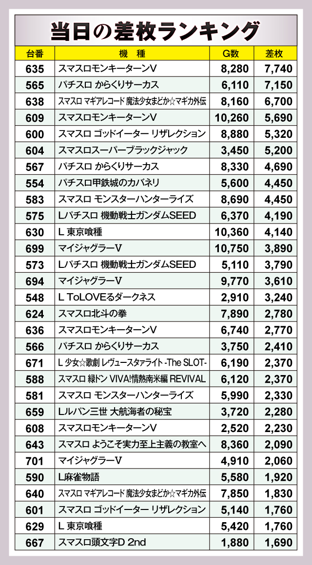 さらに『スマスロ マギアレコード 魔法少女まどか☆マギカ外伝』638番台が+6,700枚。『スマスロ ゴッドイーター リザレクション』600番台が+5,320枚。『スマスロスーパーブラックジャック』604番台が+5,200枚と並ぶ。以下にも3,000枚、4,000枚超えが多数誕生していて、非常に見応えのあるランキングが出来上がっていた。