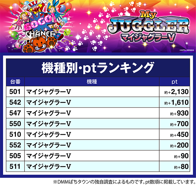 「ゴーゴージャグラー3」も複数台がプラスとなり、571番台は約+1,010pt。