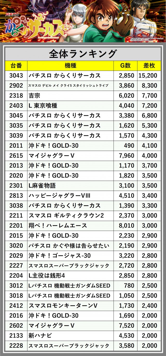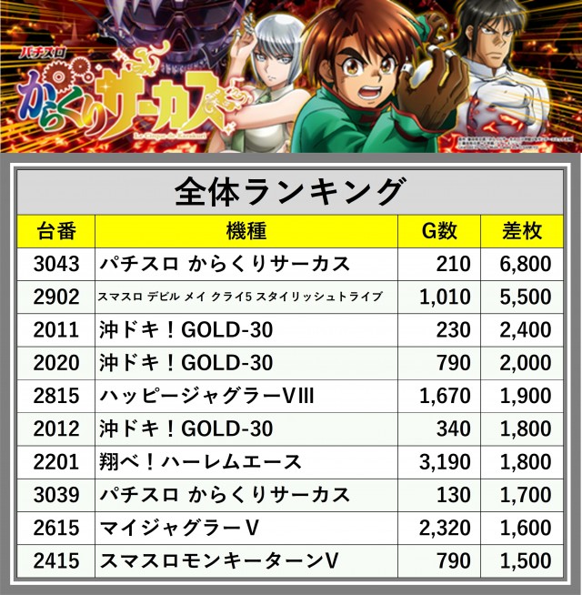 厳選された取材対象機種をはじめ、その他スロット全体から好記録が飛び出した!プレイヤーが楽しんだ1日を下記データにて振り返ってみて欲しい。