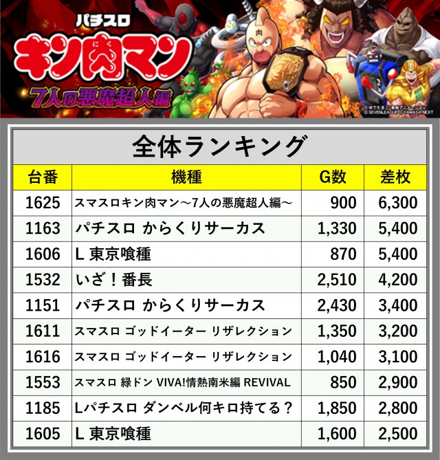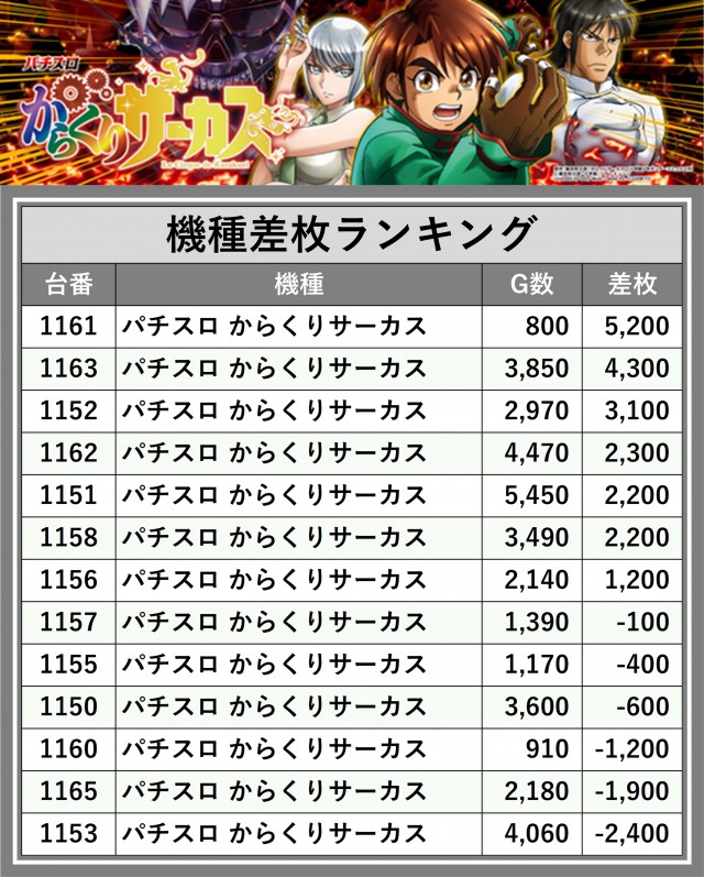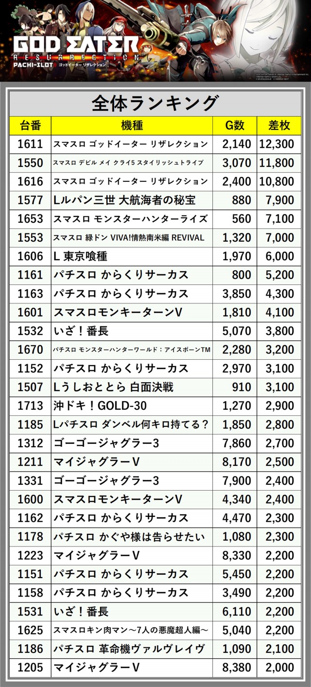 ※差枚数順に掲載しています