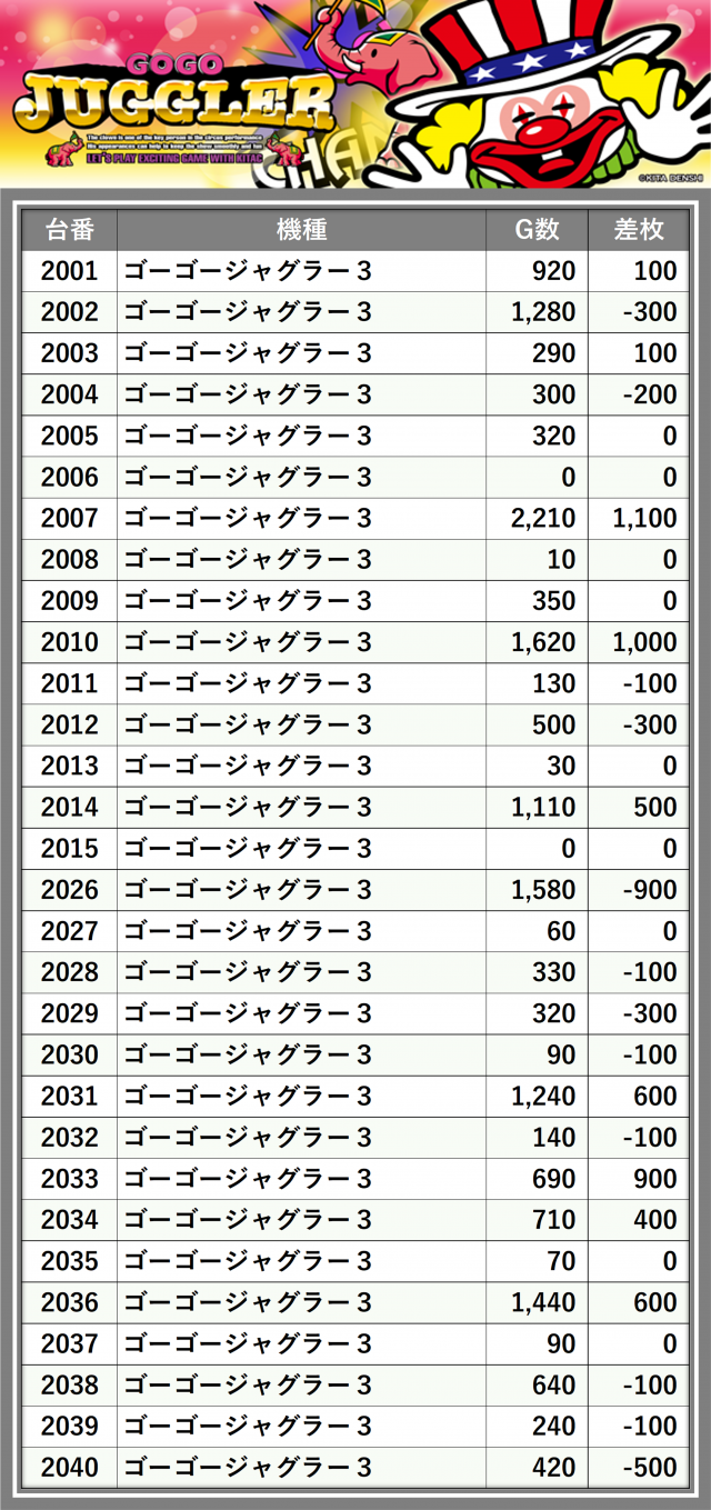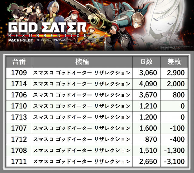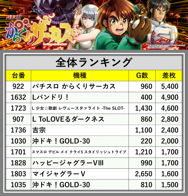 厳選された取材対象機種をはじめ、その他スロット全体から好記録が飛び出した!プレイヤーが楽しんだ1日を下記データにて振り返ってみて欲しい。