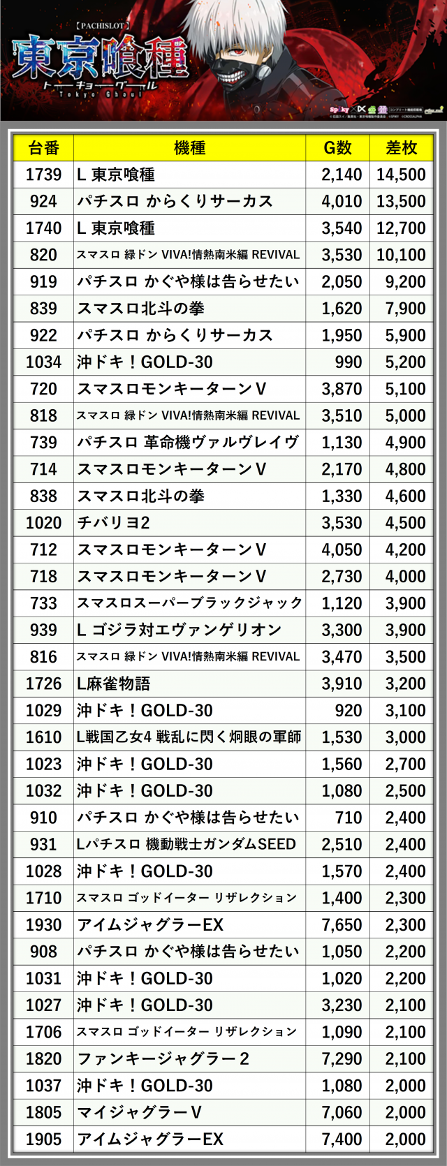厳選された取材対象機種をはじめ、その他スロット全体から好記録が飛び出した!プレイヤーが楽しんだ1日を下記データにて振り返ってみて欲しい。