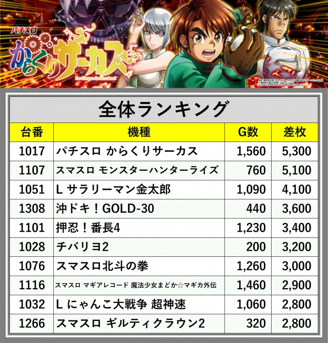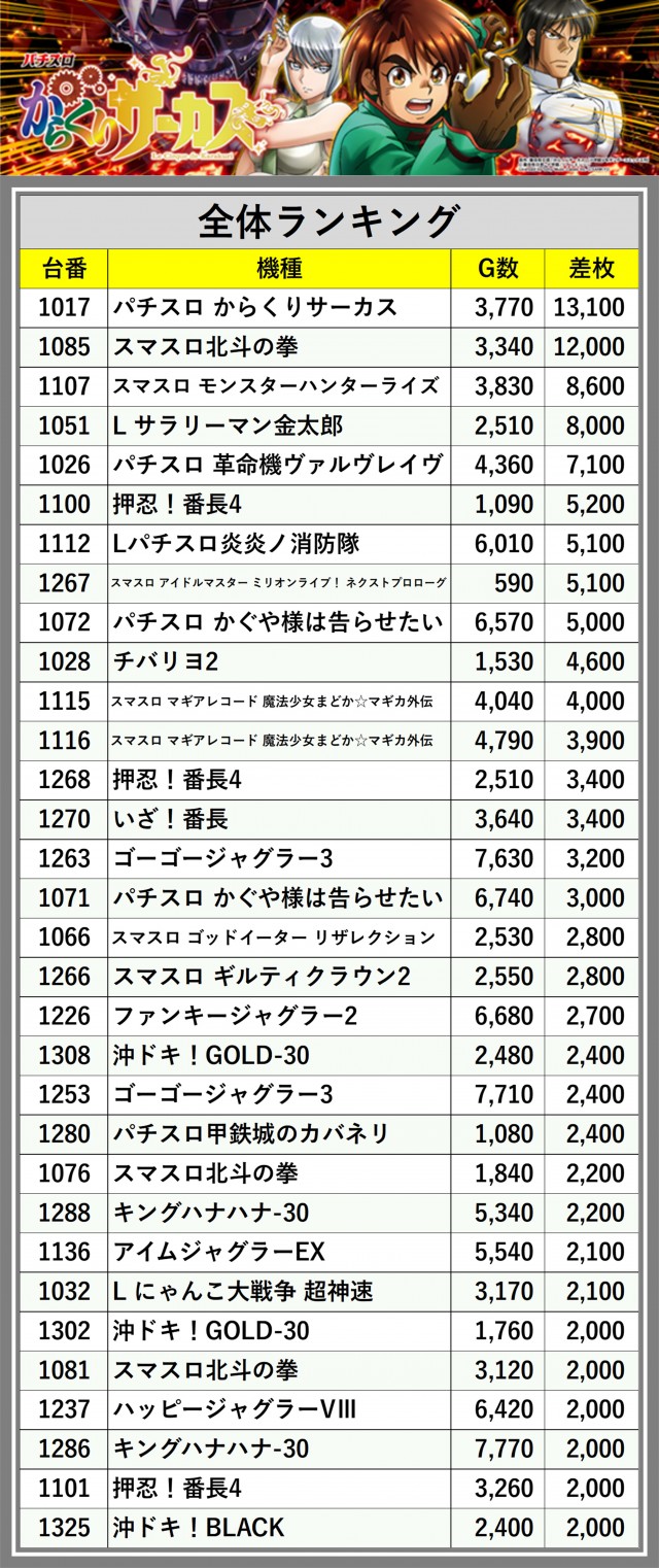 ※差枚数順に掲載しています