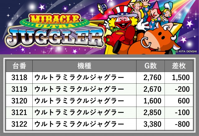 厳選された取材対象機種をはじめ、その他スロット全体から好記録が飛び出した!プレイヤーが楽しんだ1日を下記データにて振り返ってみて欲しい。