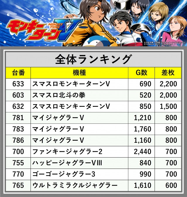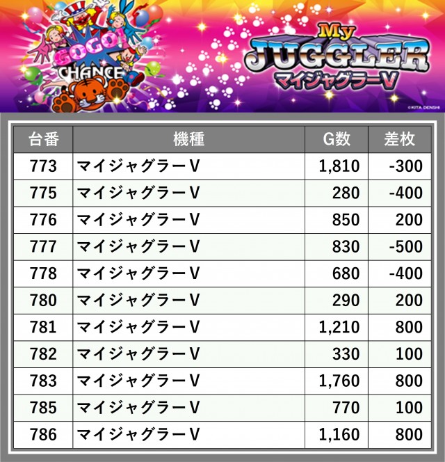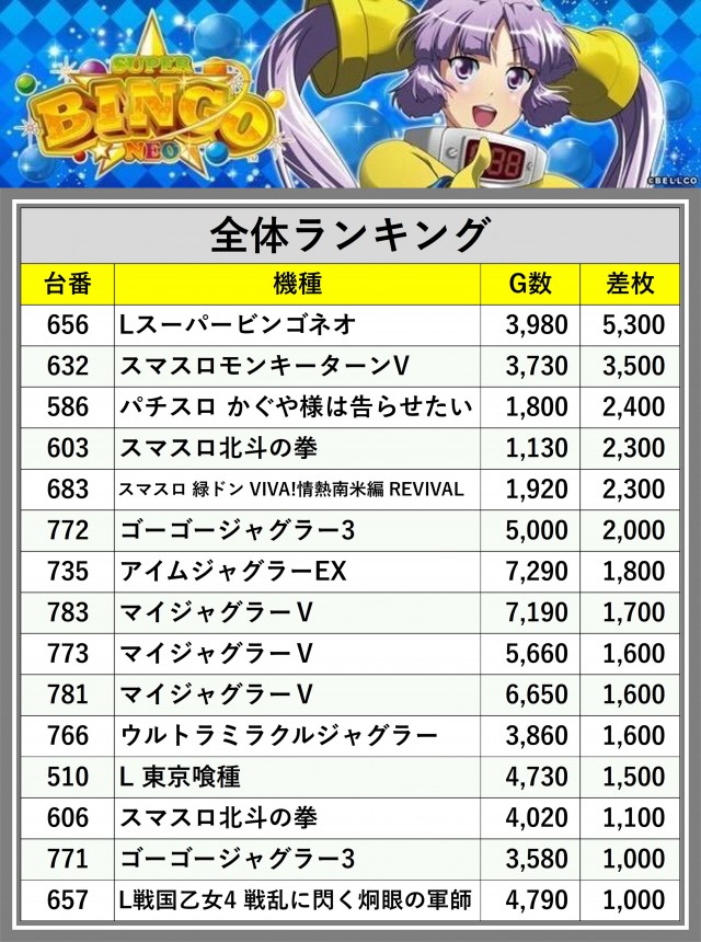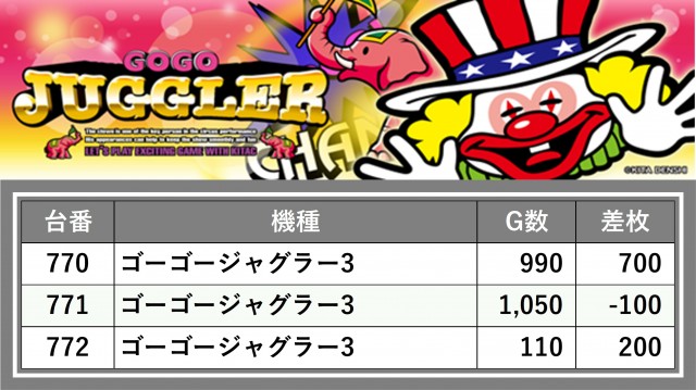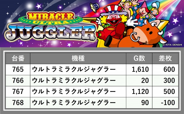 厳選された取材対象機種をはじめ、その他スロット全体から好記録が飛び出した!プレイヤーが楽しんだ1日を下記データにて振り返ってみて欲しい。