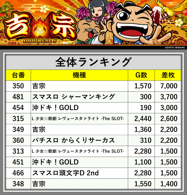 厳選された取材対象機種をはじめ、その他スロット全体から好記録が飛び出した!プレイヤーが楽しんだ1日を下記データにて振り返ってみて欲しい。