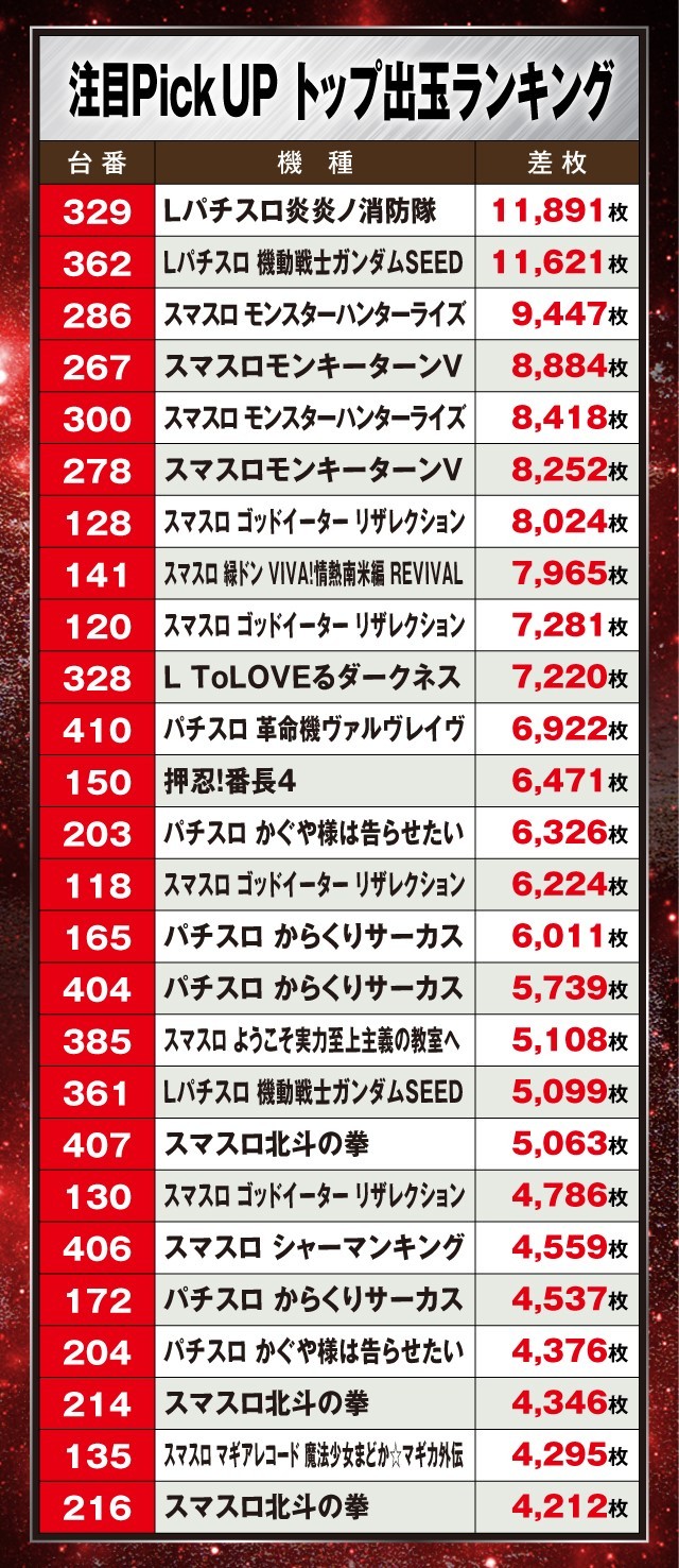 この日は、人気のスマスロを中心に多数の好調台を確認。そんな中、『Lパチスロ炎炎ノ消防隊』と『Lパチスロ 機動戦士ガンダムSEED』が+11,000枚超を叩き出しプレイヤーの注目を集めていた。続く『スマスロ モンスターハンターライズ』も万枚目前の+9,447枚を記録しており、差枚ベスト3が実にハイレベルな結果を残している。