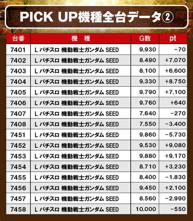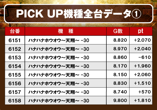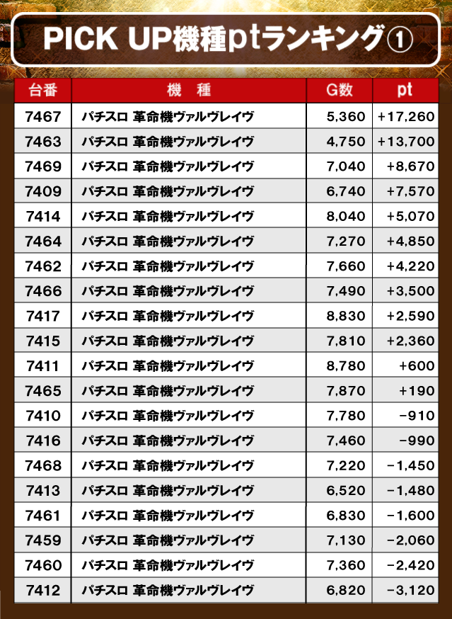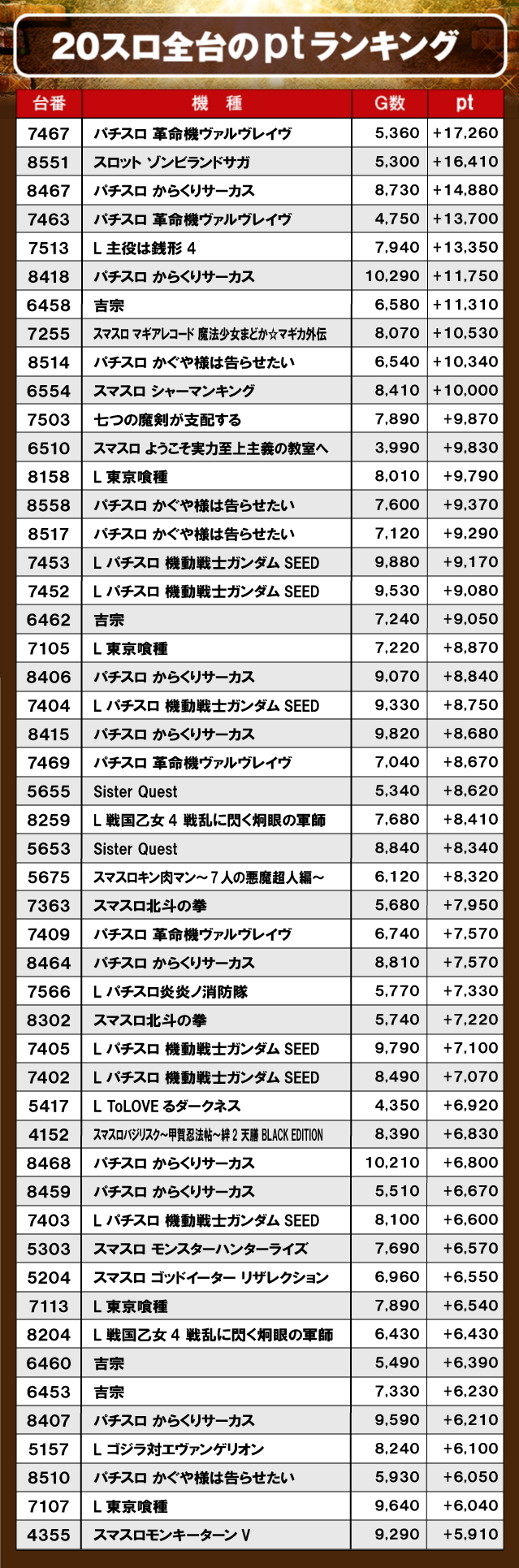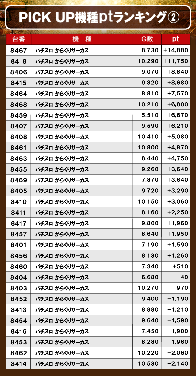 差枚ランキング50台のほぼ全てが+6,000ptOVERとなっており、万ptOVERも10台という素晴らしい結果だった!また、様々な機種が名を連ねていることから、店内のどこからでもチャンスがあったことが窺える。
