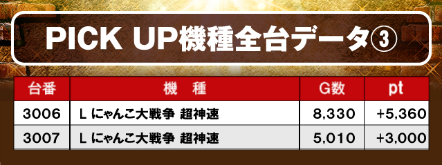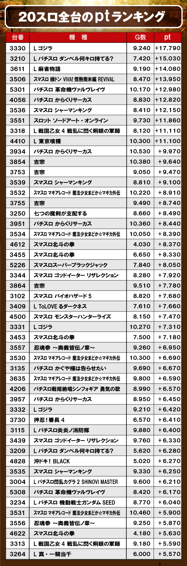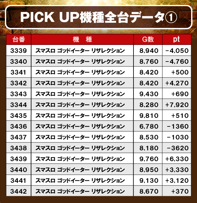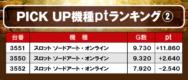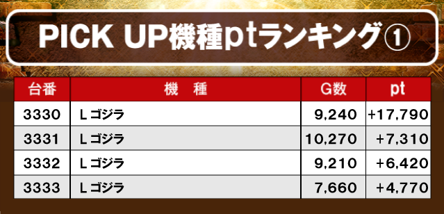 こちらは大きなプラス差枚台を確認した3機種である!惜しくもコンプリートには届いていないが、『Lゴジラ』からは+17,000ptOVER!また、『スロット ソードアート・オンライン』『スマスロ シャーマンキング』からも万ptOVERが生まれ、機種全体でも高いパフォーマンスを披露!文句の付けようがない素晴らしい結果だった!