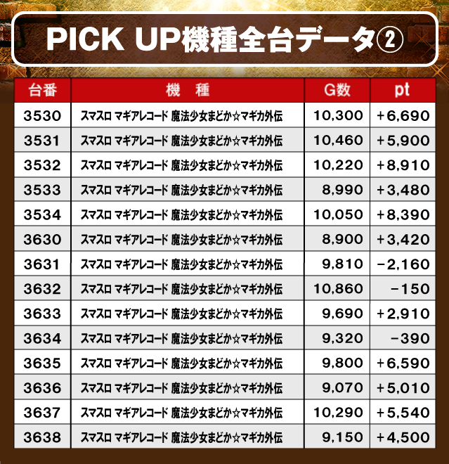 こちらは全台が盛り上がりを見せていた3機種だ!その中でも特に高いパフォーマンスを見せていたのが『スマスロ マギアレコード 魔法少女まどか☆マギカ外伝』だ。半数以上がプラス終了となっており、回転数を見てもファンが自信を持ってレバーを叩いていたのは間違いないだろう。
