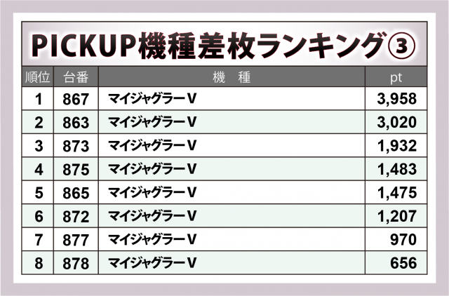 『マイジャグ』20台での勝利台は半数に届かず。しかし867番台が+4千弱とシリーズ最多のpt数を導いた他、+3千超が1台・+1千超が4台と、上2機種に対抗した。