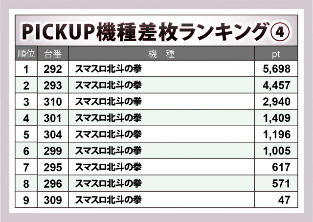 『スマスロ北斗』20台のプラス台割合は惜しくも5割を逃したが、292番台が+5千7百弱、その上+4千5百弱・+2千9百超が1台ずつ&+1千超が3台と、大量獲得と安定度の両立が見受けられた。