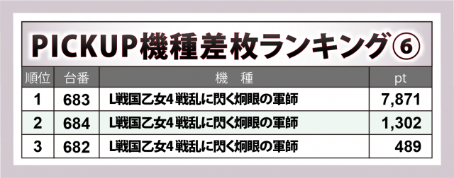 『L戦国乙女4 戦乱に閃く炯眼の軍師』4台も勝率の高さが目立ち、683番台の+7千9百弱という出玉が輝かしかった。