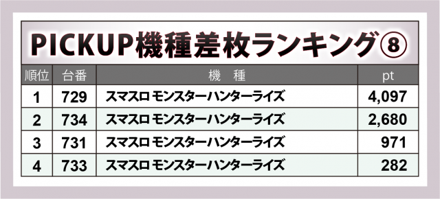 『スマスロ モンスターハンターライズ』7台もプラス率5割オーバー、+4千1百弱・+2千7百弱が1台ずつと、盛況が感じられた。