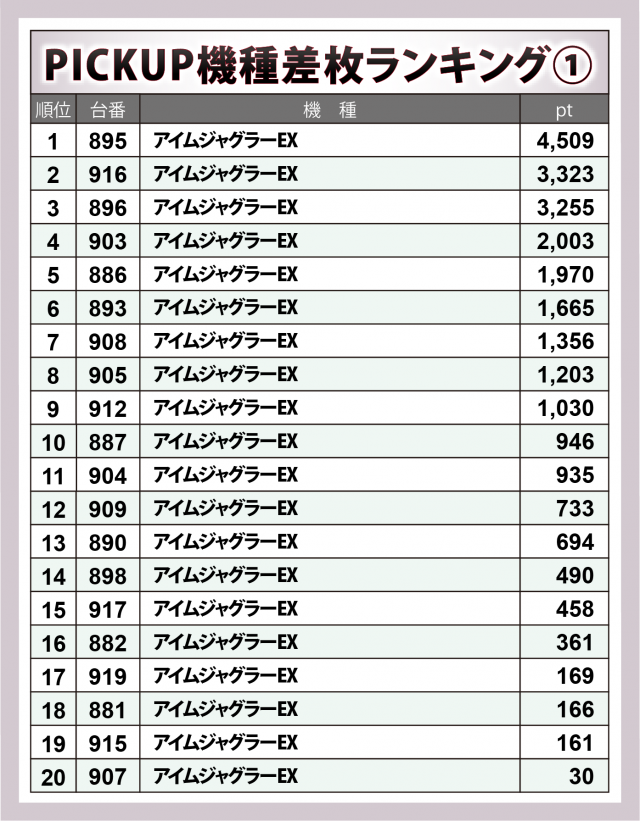 『アイムジャグラーEX』40台はピッタリ半数が勝利。895番台の+4千5百超を筆頭に+3千3百付近が2台・+2千超が1台・+1千超が5台と、シリーズ一番の盛り上がりを迎えた。