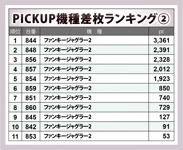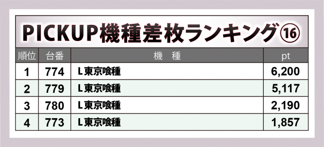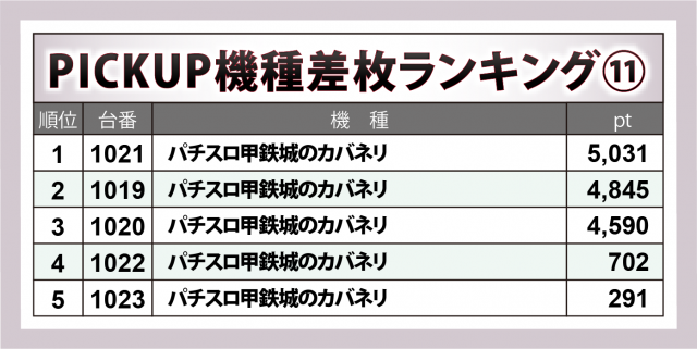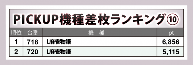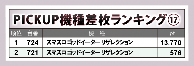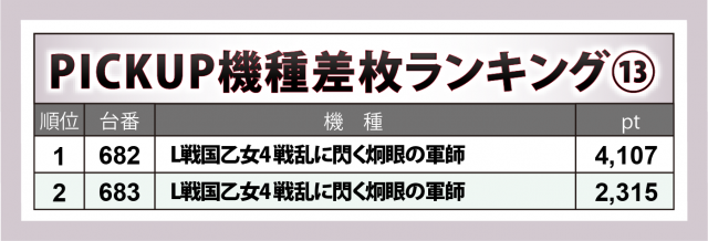 続いては主軸機種を凌ぐ出玉を残した13のマシンに注目。幅広いラインナップに好調台が生じていた。